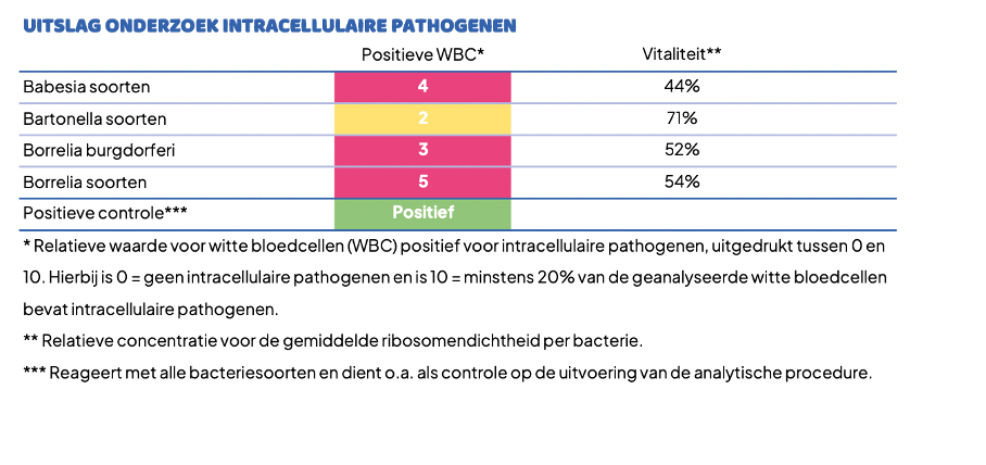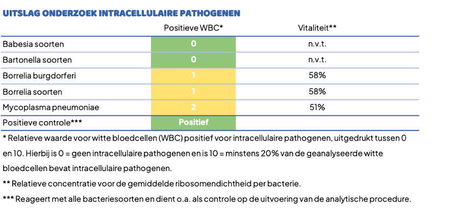 Sinds ongeveer een jaar werk ik ook met een uitgebreide bloedtest die DNA van de Lymebacterie en mogelijke co-infecties kan aantonen. Deze test richt zich niet op antistoffen (zoals bij reguliere Lyme-tests), maar kijkt direct naar genetisch materiaal van de ziekteverwekkers. Dat kan waardevolle aanvullende informatie geven, vooral bij mensen bij wie antistofvorming beperkt of verstoord is, wat vaak voorkomt bij langdurige klachten.